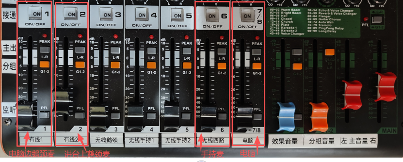 其中: 第1路贴“有线1”的是控制主席台左边电脑边的鹅颈麦的音量;