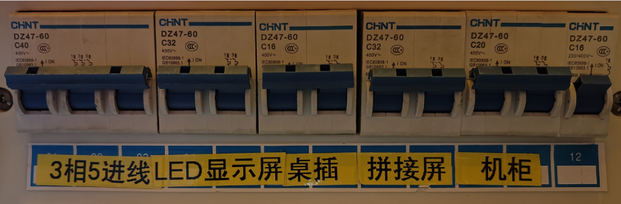 1、 打开设备间的墙上配电箱的电源,如下图,把闸都向上开启。