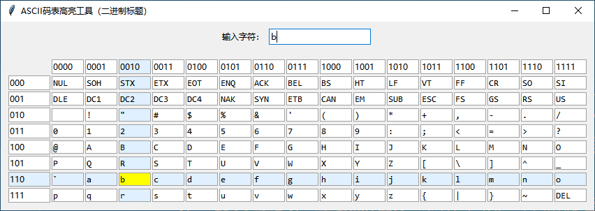 “以上的表格,我想用python编写一个窗体程序,演示如下效果。窗体里是刚才你提供的简洁的ASCII表格,窗体里还有一个输入框,输入符号后,ASCII表格里的字符能高亮显示,同时该字符所在的行、列背景也高亮显示。”