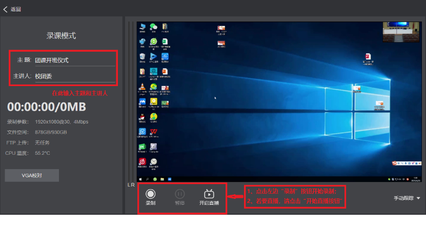 3.输入主题和主讲人,然后点击“录制”,若要直播,请点击“开启直播”
