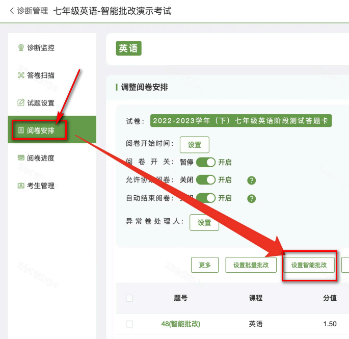 扫描完成后,考试发布人点击首页待办中的【诊断管理】,选择【阅卷安排】,点击【批量设置智