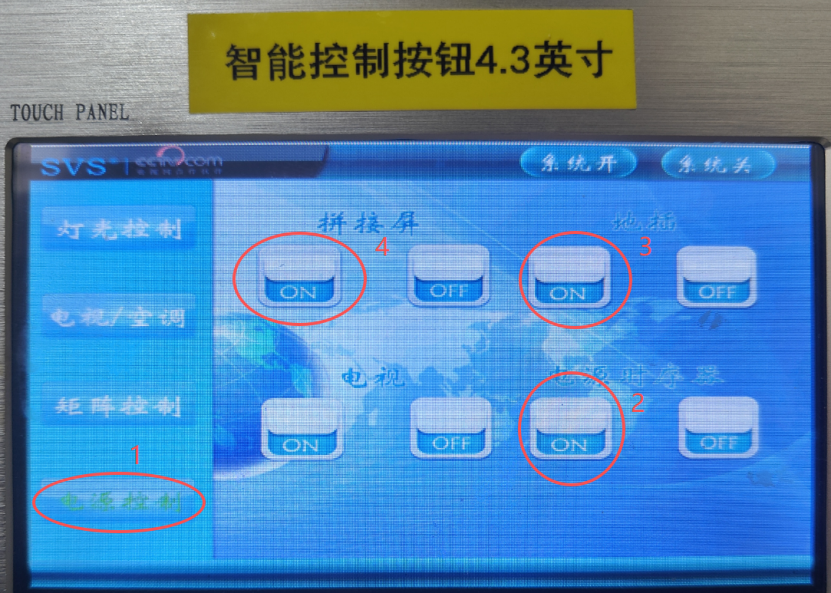 2. 轻触另一边门边的设备柜上的智能控制面板的屏幕,用手点屏幕上左边1“电源控制”,然后依次点右边2“电源时序器”下的ON开关,3“地插”下的ON开关,4“拼接屏”下的ON开关,设备会自动依次打开电脑和墙上的大屏电源。