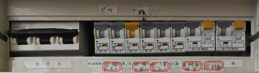 1. 打开门边的墙上配电箱的电源,如下图,把闸都向上开启。