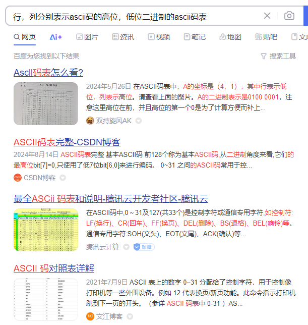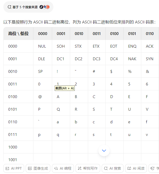 提问:行,列分别表示ascii码的高位,低位二进制的ascii码表