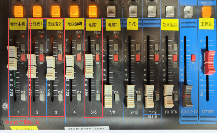 其中: 第1路贴“会讨主机”的是控制桌面6个鹅颈麦的音量;