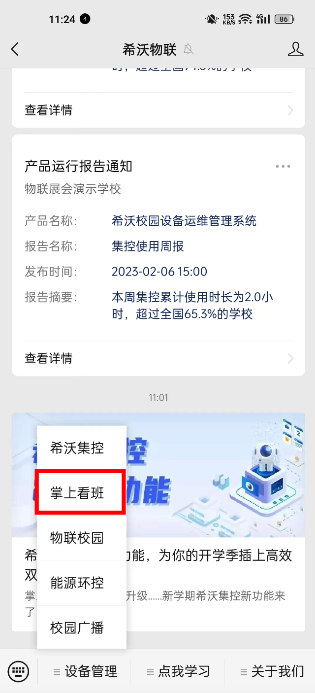 路径2:关注“希沃物联”微信公众号,点击设备管控-掌上看班