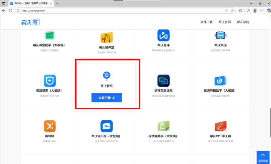 ①点击https://e.seewo.com/,找到“掌上看班”下载,并安装。