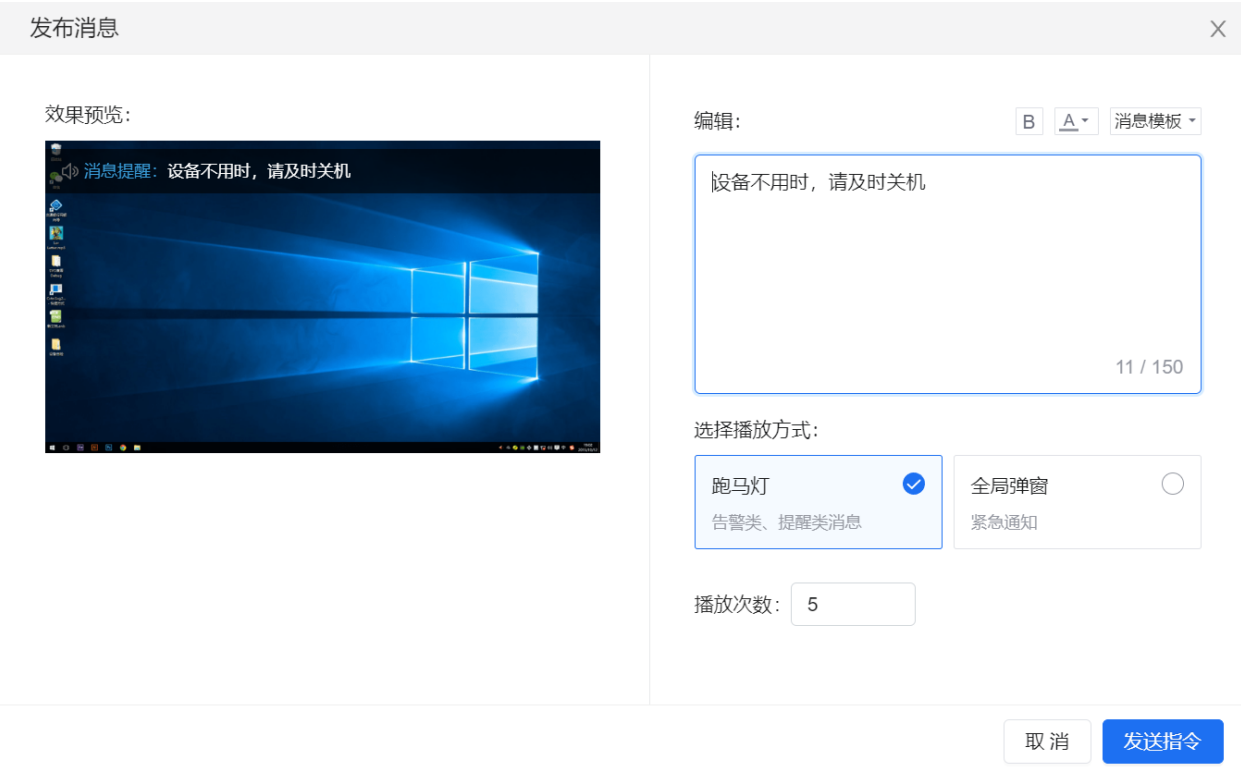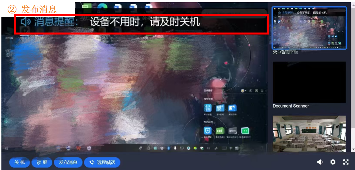 功能② 发布消息:可选择不同播放形式,消息显示在班级一体机上