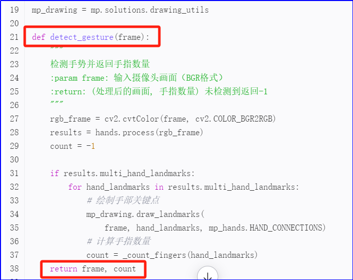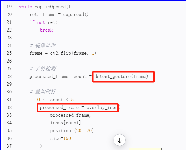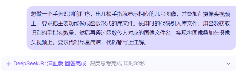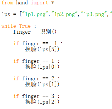 想做一个手势识别的程序,出几根手指就显示相应的几号图像,并叠加在摄像头视频上。要求把主要功能做成函数形式的库文件。使用时的代码引入库文件,用函数获取识别的手指头数量,然后再通过函数传入对应的图像文件名,实现将图像叠加在摄像头视频上。要求代码尽量简洁,代码都写上注解。